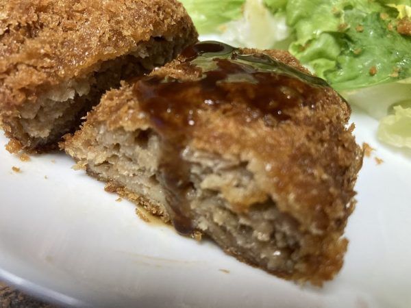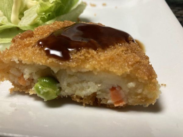この「小出畜産」さんのお惣菜はどれも衣が薄くサクサクなんですよね〜。(写真下は野菜コロッケです)