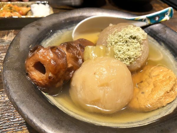 こちらがウリのおでん。お任せの中身は、ちくわ、大根、かぶ、がんも。よく味がしみて、伺ったのは残暑厳しい日でしたが、夏でも食べたいおいしさでした。