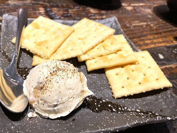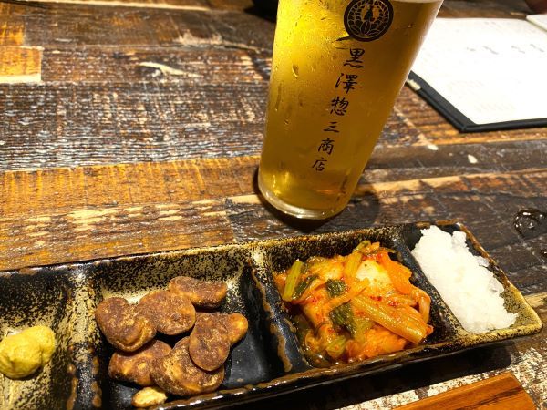 まずは、お通しの「黒糖そらまめ」「かぶのキムチ」とビールで乾杯。