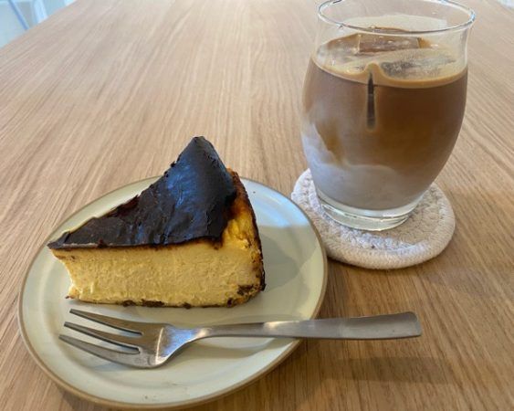 来店前にSNSを見ていたら、チーズケーキがおいしいとの情報があったのでデザートとカフェラテもいただきました。濃い目の焼き色で、真ん中のチーズがなめらかでした。