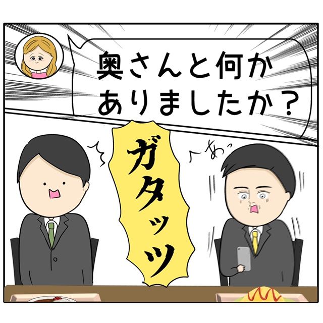 すると「奥さんと何かありましたか?」スマホに届いたふり子さんからのメッセージを見て驚き、テーブルをガタッ!!と動かしてしまいました。