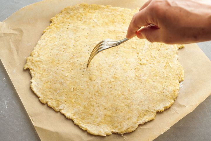(2)のばした生地(基本の生地の作り方(7)参照)全体にフォークで穴をあける。