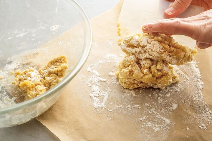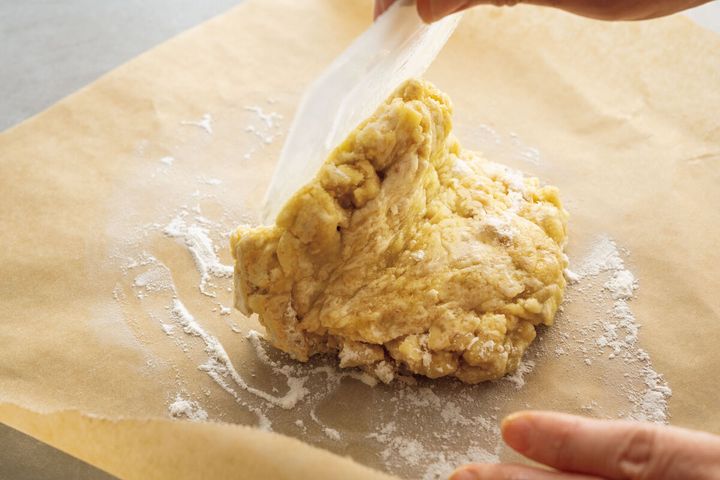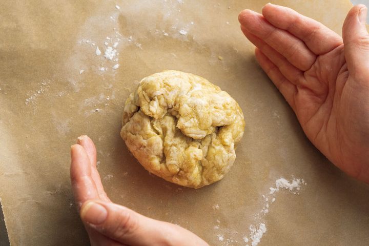 (4)生地の縁を指で立ち上げ、生地の層をつぶさないようにやさしくひだを寄せて内側に折り込み、両手で丸く形を整える。
