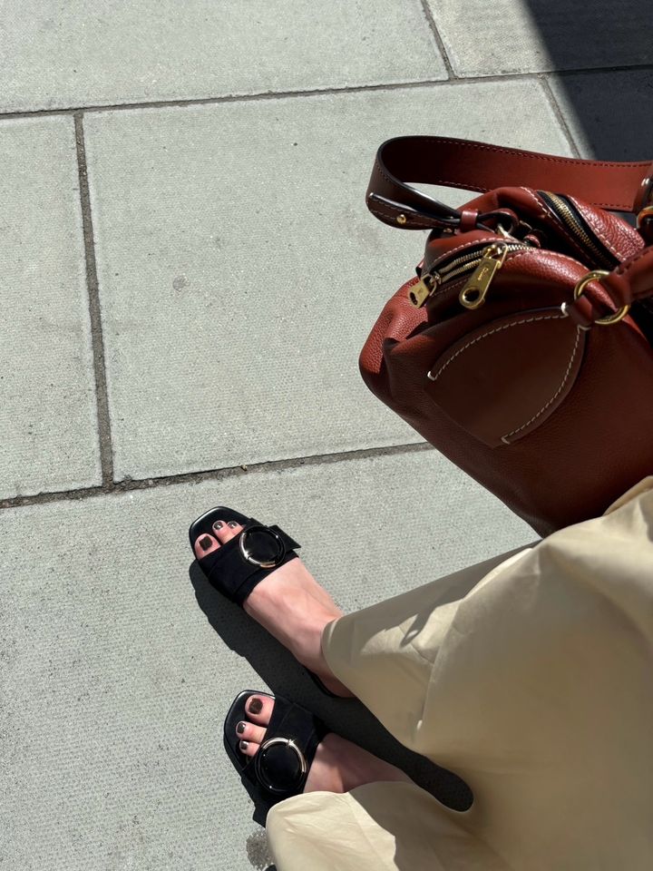 「小物はベージュ&ブラウン系でまとめて、少し秋らしさを意識しました。お腹が大きくて塗るのがちょっと大変ですが、コーデに合わせてペディキュアも楽しんでいます。ワンピースのウエストリボンは取り外し可能なので、臨月の今は外してゆったりシルエットを満喫しています」