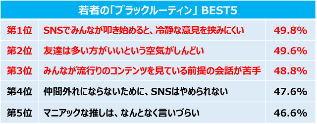 一方、学生や20代においては、「SNS でみんなが叩き始めると、冷静な意見を挟みにくい」を筆頭に、「友達は多い方がいいという空気がしんどい」、「みんなが流行りのコンテンツを見ている前提の会話が苦手」、「仲間外れにならないために、SNSはやめられない」、「マニアックな推しは、なんとなく言いづらい」 など、SNSの利用拡大に伴い、SNSシーンでの「ブラックルーティン」が多くを占めるといった結果に。