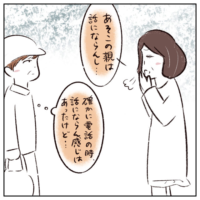 「あそこの親は話しにならんし・・・」と諦めた様子で話す前田さんを見て、以前電話で話したときのさなかちゃんのお母さんのことを思い返し「確かに電話の時、話にならん感じはあったけど・・・」と共感するお母さん。
