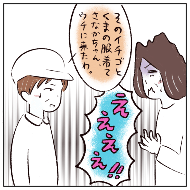 まるさんのクラスメイトのお母さん前田さんと、さなかちゃんの話しをしていたまるさんのお母さん。さなかちゃんが着ていた服が明らかにサイズが合っていなかったこと、最近まるさんの服が盗まれていることを話すと、なんと前田さんもさなかちゃんが来るようになってから娘の服がなくなったと打ち明けます。そして、前田さんの家からなくなった服は、みかん狩りの日にさなかちゃんが着ていた服の特徴と完全に一致し、お母さんはさなかちゃんが前田さんの家で盗んだことを悟ります。