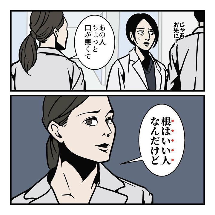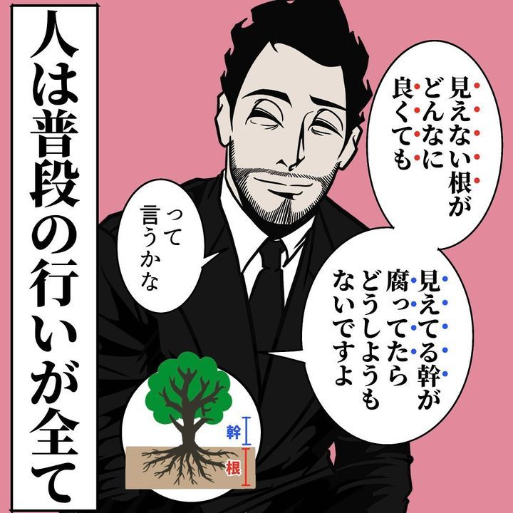 髭さんによると、同僚が上司をフォローする際に言った“根はいい人”は免罪符なのだそう。その上で「その行動の違和感から目を背けがちだよね」と断定します。そして、反論するなら「見えない根がどんなに良くても見えてる幹が腐ってたらどうしようも無いですよ」と言うだろうと答えるのでした。