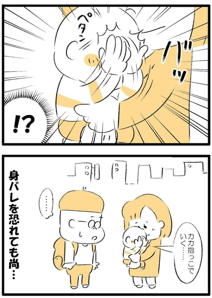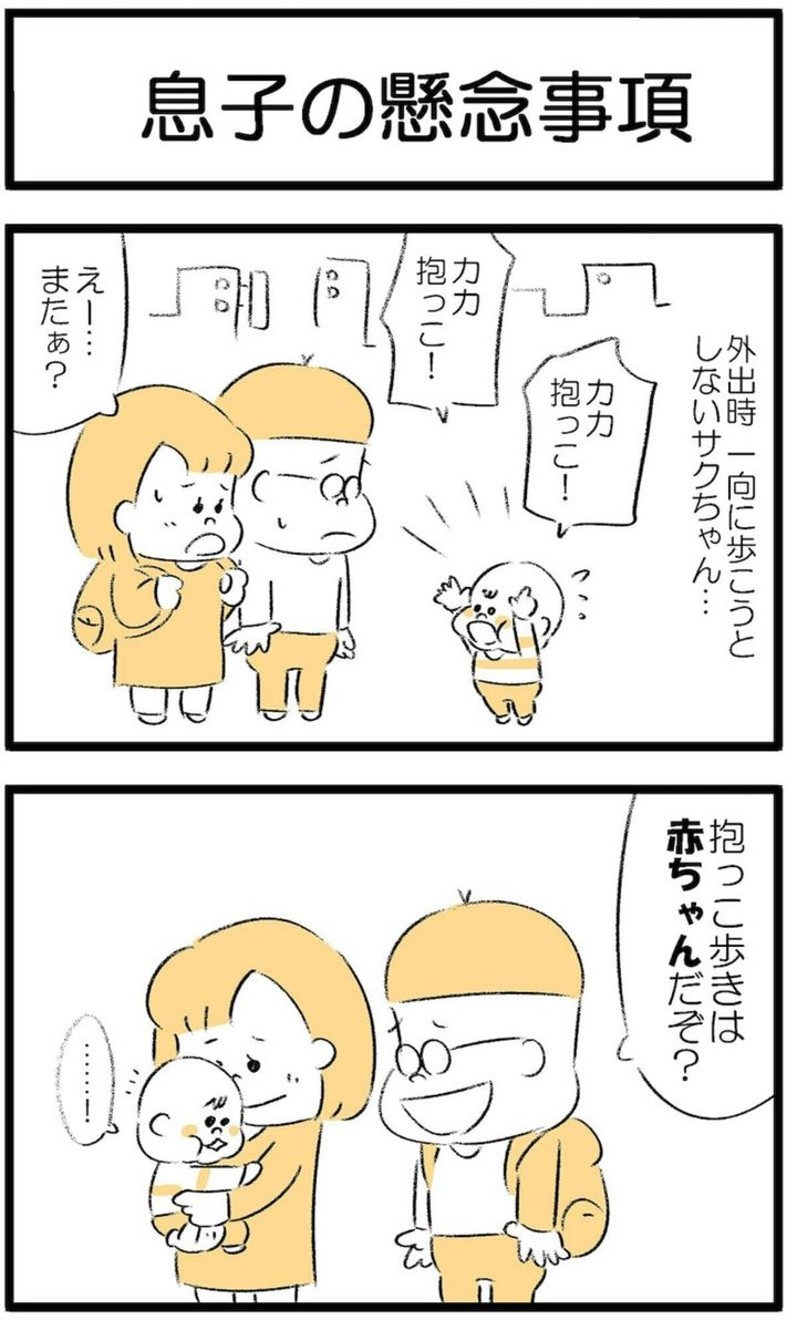 家庭の事情で思い切って育休を取得したトンさん。今回は息子のサクちゃんが2歳ごろのお話です。抱っこが大好きなサクちゃん。お散歩をしてもなかなか自分では歩きたがりません。2歳になり、少しずつ自尊心が芽生え始めてきたサクちゃんですが、どうしても抱っこしてもらいたい…。そんなサクちゃんの苦渋の選択はどのようなものなのでしょうか。どうぞご覧ください。