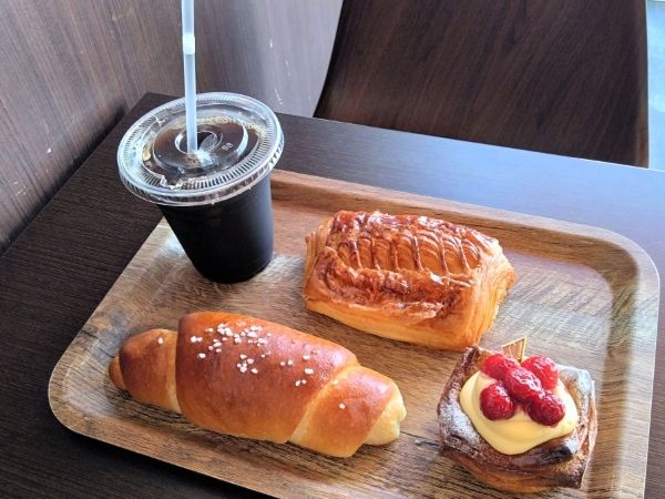 店員さんにオススメを聞くと、一番人気は、塩パンだということで、早速トレーに入れます。他に、こちらも人気だというアップルパイと、見た目のかわいさにひかれ、ラズベリーデニッシュをチョイス。イートインスペースを利用したかったので、アイスコーヒーも注文しました。