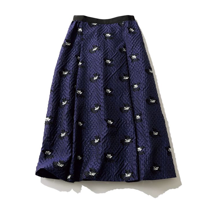 凹凸のあるジャカード地に、花モチーフがあしらわれた華やかさ満点のスカート。ネイビー調で老若男女問わずに好印象をキープできるから、送迎⇄会社の動線も難なくクリアできる。ネイビージャカードスカート¥36,300(エッフェ ビームス/ビームス ハウス 丸の内)