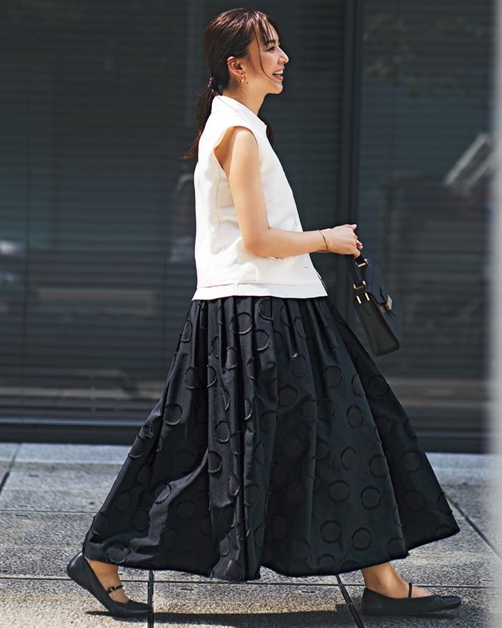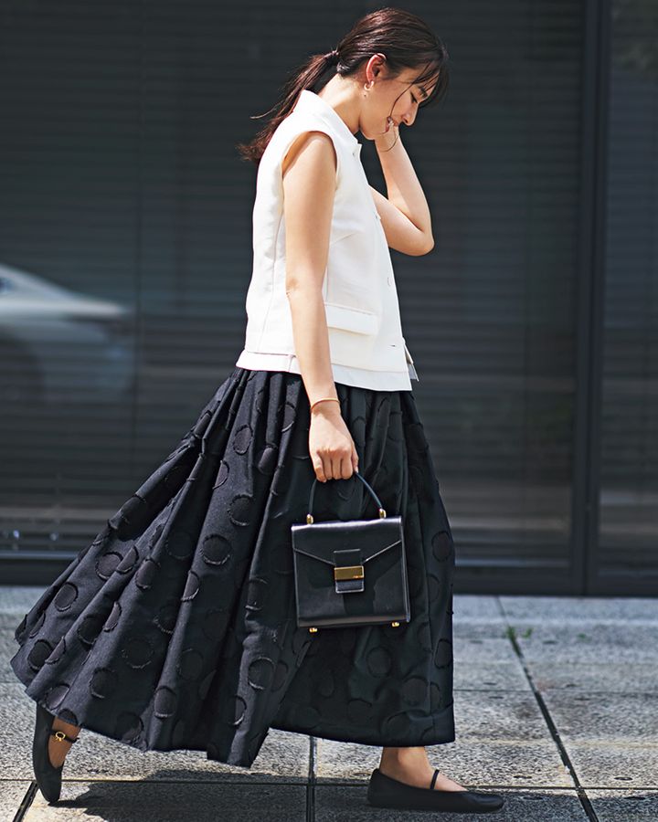 ギャザーをたっぷりあしらった分量感で何でもない通勤日も特別感が出せる逸品。ウエストがキュッと引き締まる絶妙パターンで、お腹や腰回りの体形カバーにもひと役。大ぶりなドット柄のジャカードは、お休みの日のカジュアルにも使いやすい!シャツブラウス¥46,200(アキコ オガワ)ボリュームスカート¥34,000(シーニュ)ピアス¥275,000〈プロジェビア〉ブレスレット¥176,000〈ベッティーナ ジャヴァエリ〉(ともにロンハーマン)バッグ¥198,000(セルジオ ロッシ/セルジオ ロッシ カスタマーサービス)靴¥108,900(ジャンヴィト ロッシ/ジャンヴィト ロッシ ジャパン)