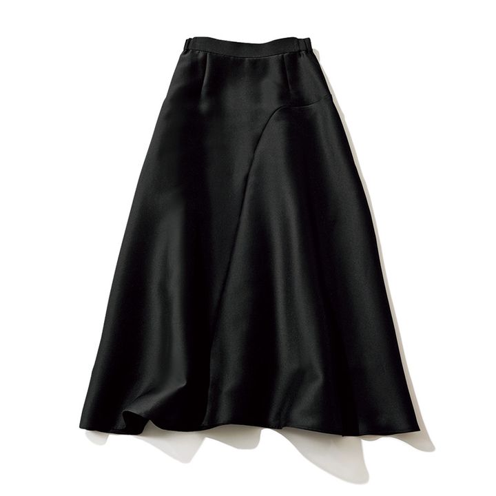 美しいハリのある光沢素材とアシンメトリーな裁断が特徴的な名品スカートは、VERYスタッフにもファンが多数!華やかながらきちんとドレスコードもクリアできるのが嬉しい。バックウエストはゴム仕様。黒サテンフレアスカート¥41,800(MW)