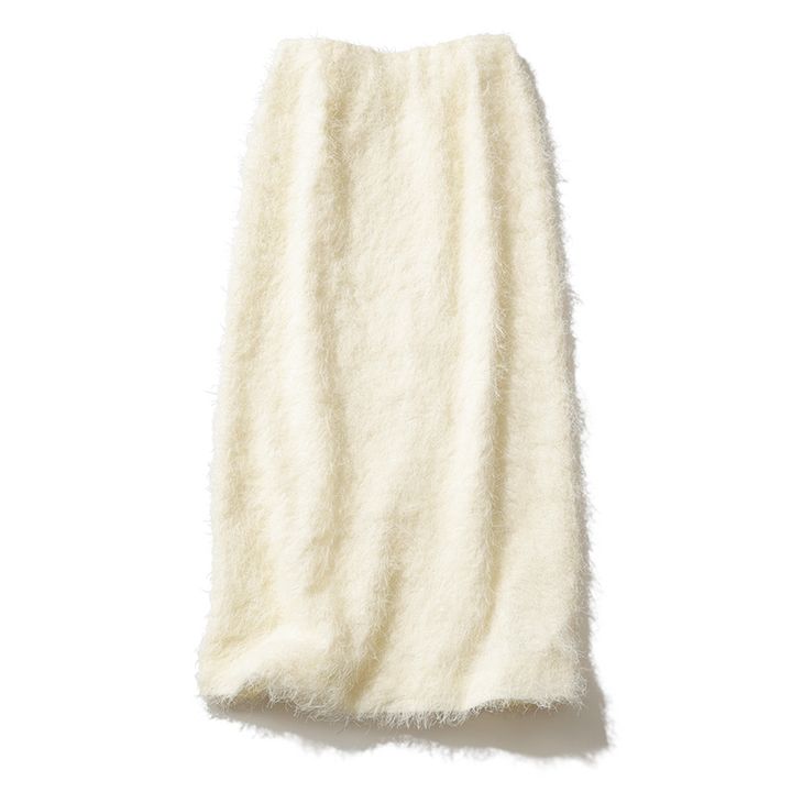 凹凸のあるシャーリングで、気になるお腹やお尻周りを拾わず着痩せも実現。ともすると糖度高めな白スカートでも、ストレートシルエットにすることで大人っぽさをプラス。後ろスリット入りで足さばきも◎。白シャギースカート¥13,970(ミラ オーウェン/ミラ オーウェン ルミネ新宿2店)