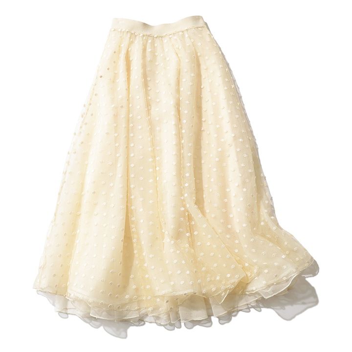 透け感のあるチュールにドットの刺繡がデザインされており、リッチ感も際立つ一枚。チュールでも落ち感のある上質素材だから、電車通勤でも広がりすぎず使いやすいのが高ポイント!ドットチュールスカート¥41,800(マリリンムーン/マリリンムーンオンラインストア)