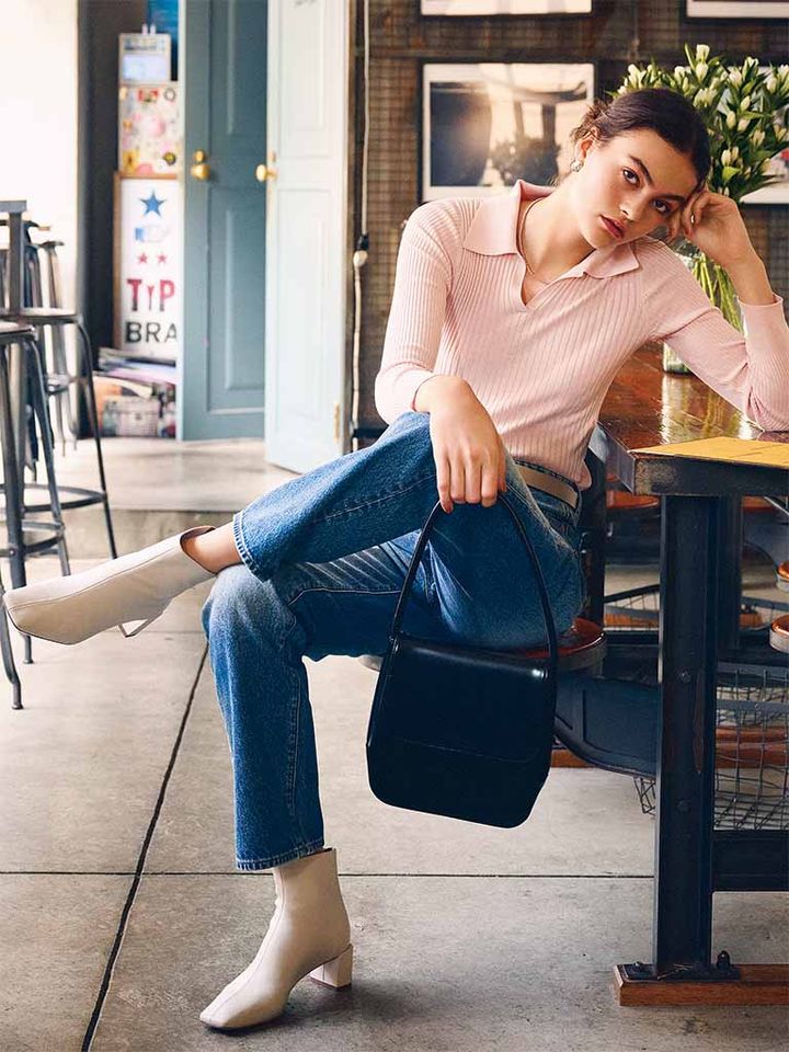 夏に履いてきたオーソドックスなブルーデニムも、ブーツを仕込めば肌感をおさえたレディな面持ちに。カジュアル感が強いぶん、色みは黒よりも白を選んで潔くキレイを求めて。細身より落ち着いて仕上がる、幅の狭いスクエアトゥ+太ヒールの大人っぽいフォルム。