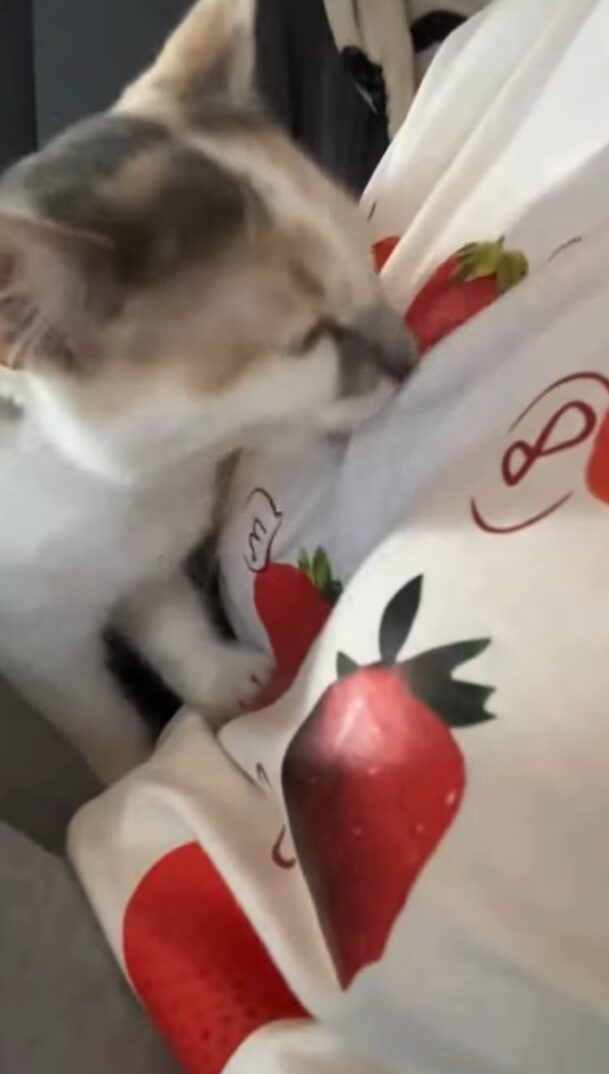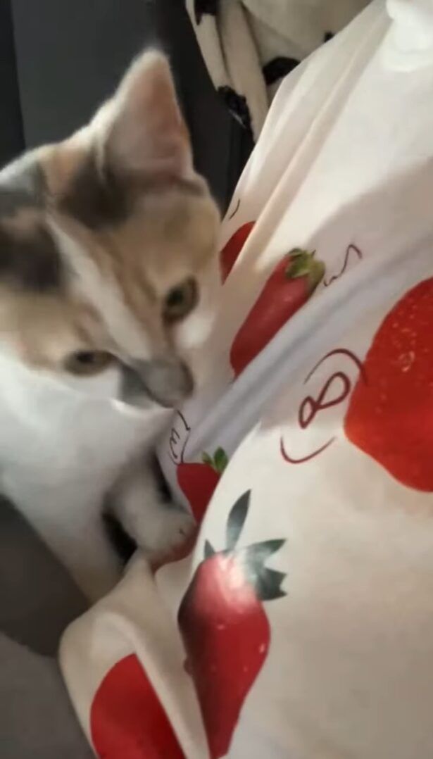 まるで飼い主さんに甘えているような光景ですが・・・。 よく見ればネコがペロペロしているシャツにはイチゴがプリントされています。