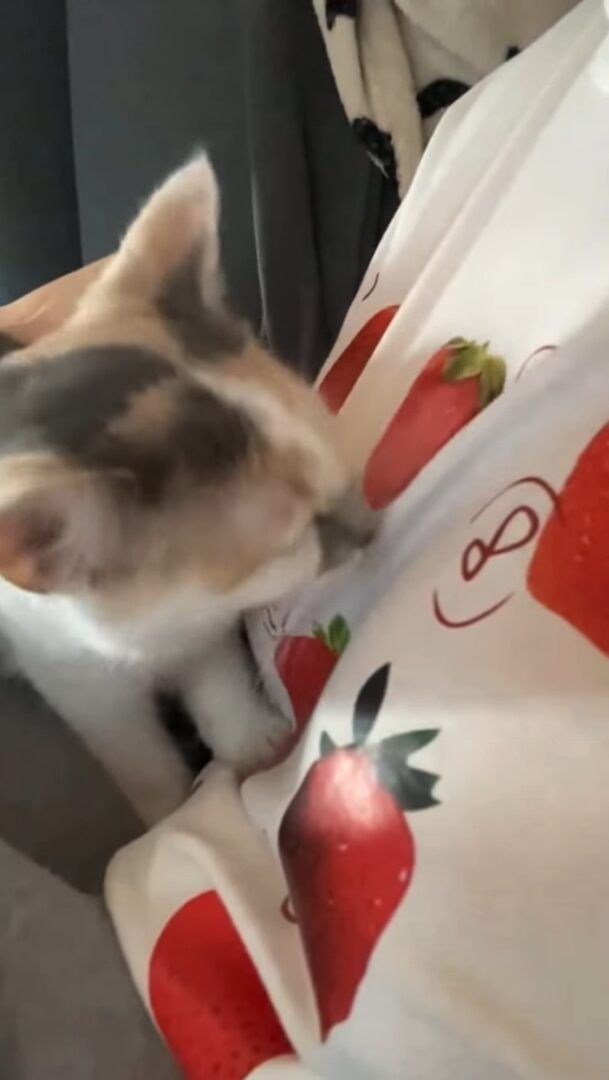 食いしん坊なネコ。 飼い主さんのシャツにプリントされたイチゴを本物だと思い込んだみたい。