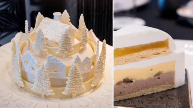 「マロンカラマンシー」は雪に閉ざされた森の中の村をイメージ。砕いた栗のシロップ漬けを含んだ栗のムースや、東南アジアの柑橘果物カラマンシーのムースなどが、ホワイトチョコレートの真っ白なムースに包まれています。
