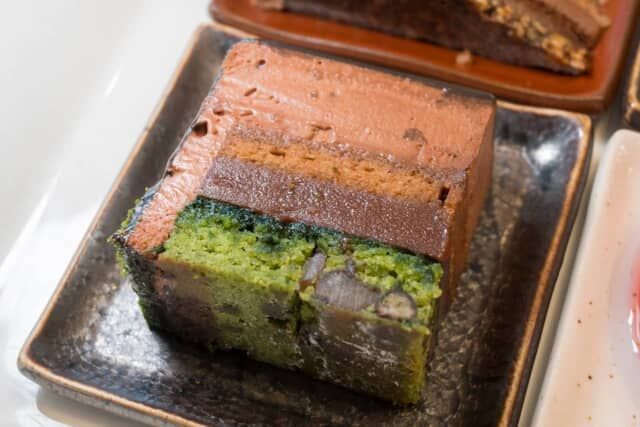 ジャポネハーブ・ショコラはチョコレートのムースや、チョコを配合したバーターケーキ、さらにチョコの羊羹などを重ねたチョコ尽くし。大粒のあずき “大納言” の入ったよもぎのケークが緑色の土台に使われます。