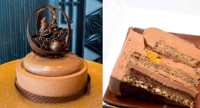 ショコラを存分に楽しめるもうひとつのケーキが「ショコラアールグレイ」。ミルクチョコレートとアールグレイの組み合わせに、オレンジのコンフィがアクセント。ケーキの先端と中心部では味が異なり、食べ進めながら変化を楽しめます。ヴァローナのチョコレート “ジバララクテ” を使ったふわりと柔らかなムースショコラや、アールグレイのヌガーにアーモンドが加わるザクザクとした食感。さらにクラシックショコラなど、多彩なショコラの味が次々に重なります。