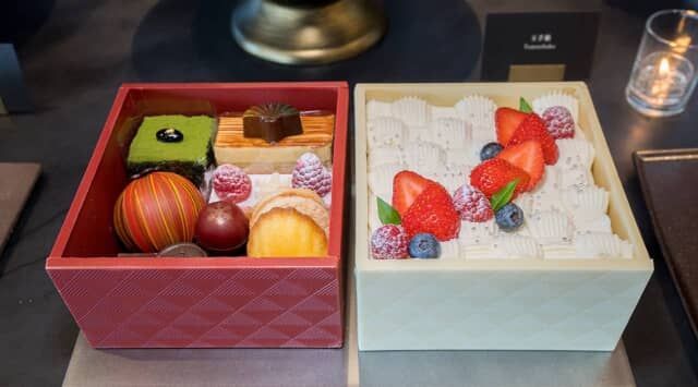 重箱はチョコレートでできていて、一の重には3種類のプティ・ガトーやオレンジショコラ、結晶ボンボンなどがビッシリと詰め込まれています。手毬チョコは工芸品レベルの美しさ。二の重は、フタを開けた瞬間に部屋中に香りが広がる嘉山農園の苺を使ったショートケーキになっています。