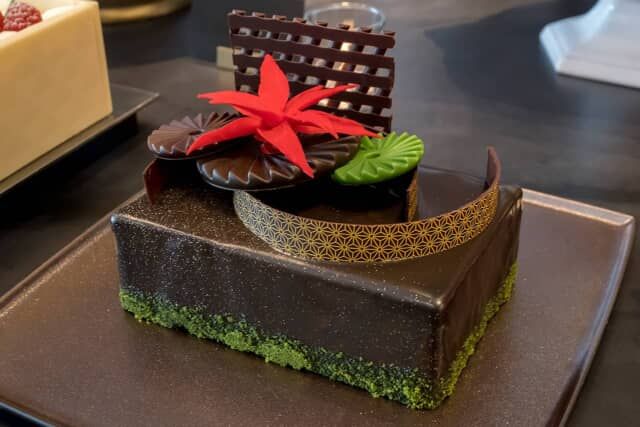 ペストリー料理長の生野剛哉氏が、今年最もチャレンジしたという「ジャポネハーブ・ショコラ」は、カカオ66パーセントの濃厚なチョコレートと、草餅などに使われる “よもぎ” を使い、深紅の花が驚きを誘うケーキです。