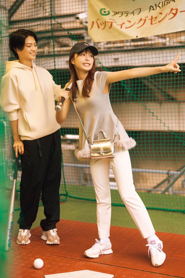 (宇垣さん)ニット¥17,600/CELFORD パンツ¥19,800/クードシャンス(ワールド プレスインフォメーション) キャップ¥5,060/ニューエラ バッグ¥17,050/ダイアナ(ダイアナ 銀座本店) スニーカー¥13,090/ニューバランス(ニューバランスジャパン お客様相談室) ソックス/スタイリスト私物 (岩瀬さん)プルオーバー¥8,990/PLST パンツ¥4,990/UNIQLO スニーカー¥13,090/ニューバランス(ニューバランスジャパン お客様相談室)