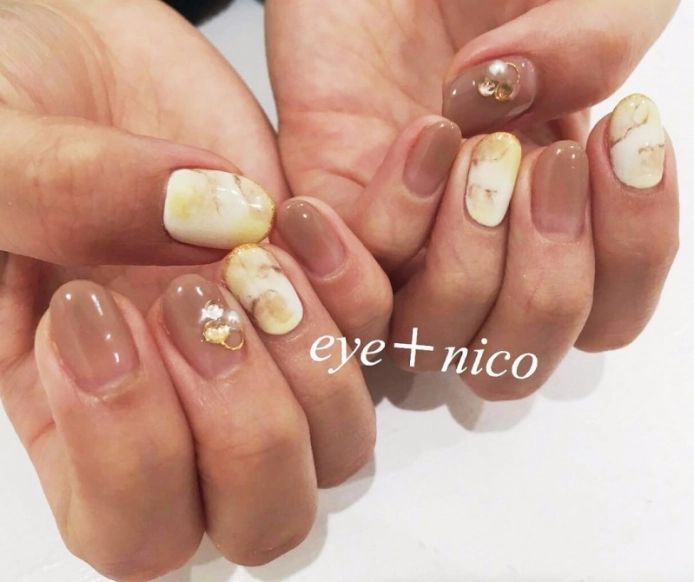 落ち着いた大人の雰囲気になる大理石ネイル。今年も人気継続が予想されます。 大理石柄の色は白×黒もしくはグレーが定番ですが、ブラウンやベージュで仕上げると柔らかな雰囲気に。まわりの爪の色味によっても印象が変わるので、いろんなスタイルが楽しめます。