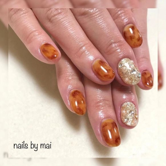 ここ数年のトレンドとなっているべっ甲ネイル。今年もその人気は衰えないと予想されます。大人女子だからこそ似合うべっ甲ネイルは、取り入れるだけで指先を上品に見せてくれますね。 写真のように1本だけキラキラに仕上げたり、べっ甲の色味を変えてみたりといろんなアレンジが楽しめますよ!全ての指をべっ甲にするのも大人っぽくて素敵です。