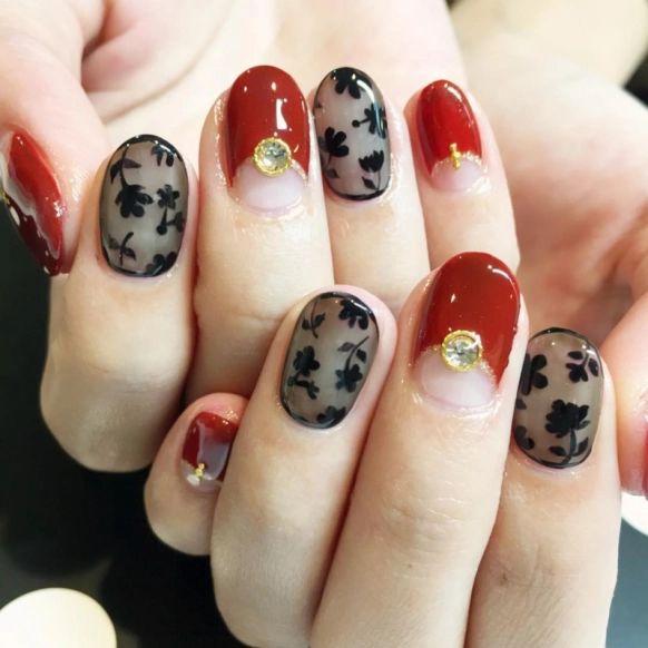 ボルドーのフレンチネイルと、花柄のシースルーネイルを組み合わせたデザインです。ボルドー×シースルーの組み合わせが色っぽい手元を演出♡ シースルーネイルは季節を問わず人気ですが、秋冬の重くなりがちなネイルと合わせると、ほどよい抜け感が作れます。大人っぽいコーデを合わせたくなるネイルですね!