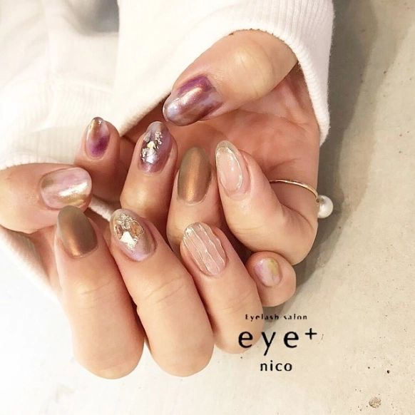 うねうねデザインやミラーネイルを織り交ぜた表情豊かなミラーネイルは、おしゃれ見え確実!マットなパープル&ゴールドの組み合わせが秋っぽく見せるポイントです。 凝ったデザインに見えますが、色味が落ち着いているのでどんなファッションとも相性が良く、デイリー使いにおすすめのネイルですよ♡