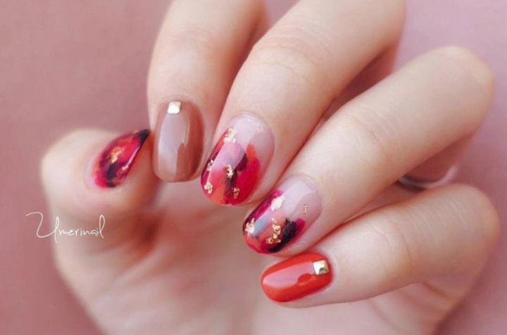 @umerinail さんの鮮やかな“紅葉ネイル”は、秋にピッタリ!塗りかけ風のデザインやブラウンを取り入れることで、リアルな紅葉のカラーリングを表現していますよね。 箔を散らしてあることでちょっぴり和風テイストも感じられるので、普段使いだけでなく和装や成人式に取り入れてもいいでしょう。
