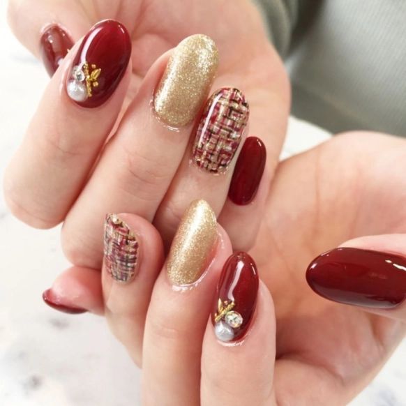 ツイードは秋冬におすすめのデザイン。ツイード地のようなネイルを取り入れることで、指先にあたたかみをもたらします。ツイードに使うカラーを変えることで、いろんな印象に♡ 写真のネイルのようにツイードのベースカラーをゴールドにすることで、よりゴージャス感がアップします。ボルドーとの相性もバッチリです!秋が深まってきたら冬を先取りして、ネイビーやグレーと合わせるのもおすすめです。