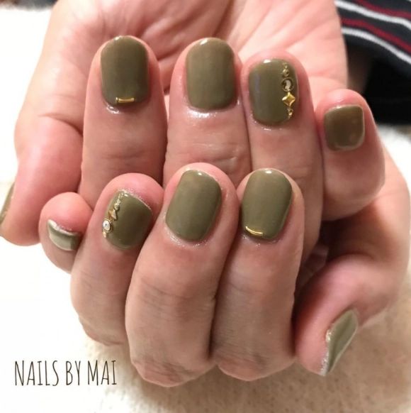秋らしいカラーといえばカーキ!ここのところ少しくすんだカーキが人気でした。色味は多少変わるかもしれませんが、今年もカーキネイルはトレンドど真ん中でしょう! また、カーキはゴールドのパーツと相性抜群。カジュアルな中にも大人っぽさをプラスできます。写真のようにシンプルなワンカラーも素敵ですが、べっ甲やニュアンスネイルと合わせるのもアリですよ!