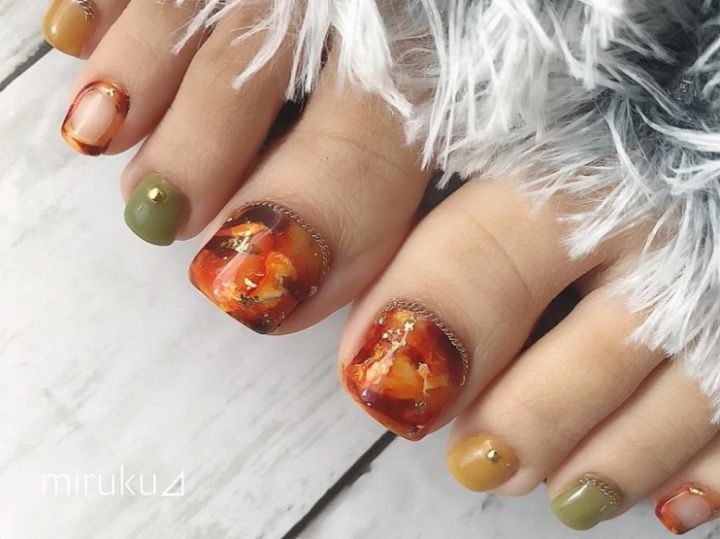 トレンドの囲みべっ甲とくすみイエロー&カーキカラーを組み合わせたニュアンスネイルは、秋に一押しのフットネイルデザインです。@sankak.uさんの作るべっ甲は、硬めのホワイトを仕込むことで天然石っぽい雰囲気に仕上げているんだとか! ホワイトをプラスするだけで、いつものべっ甲デザインに奥行きが出て、秋冬にも最適ですね。トレンドの囲みべっ甲にするのも今年らしくて◎