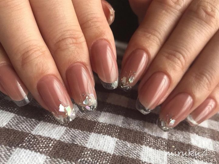 いつものシンプルなワンカラーネイルも、ちょっとアレンジを加えてクリアフレンチをプラスするだけで今っぽさがUP♡ カラーは、秋っぽくピンクブラウンカラーで統一することで上品で洗練された雰囲気に仕上がりますよ。シェルと箔ラメが使用されているのもアクセントになっていてGOODですね◎