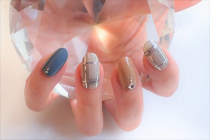 セルフネイル派にもおすすめのデザインをご紹介。こちらのチェックネイルは、ダイソーとセリアのアイテムで作れるのだそう! グレーのチェック部分の作り方は、ベースカラーを塗ったあと、濃いめのグレーで縦横にラインを引きます。まっすぐラインを引ける自信がなかったら、マスキングテープを利用するとよいそうです。 乾いたらシルバーのラインテープを先ほどのラインの上に貼り、トップコートで固定したら完成!上品な大人ネイルがこんなに簡単にできるので、ぜひチャレンジしてみて♡