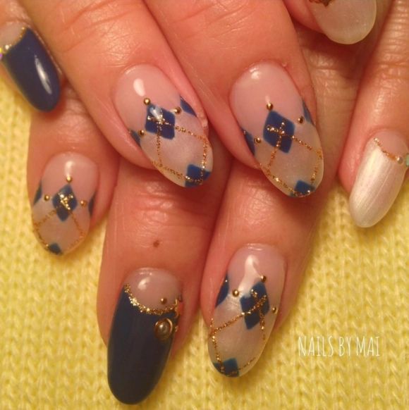 クラシックなアーガイルの柄を逆フレンチに取り入れると、抜け感がプラスできますね。かわいらしくするならピンクやベージュ、カジュアルにするならカーキやブラウン、きれいめにするならネイビーやパープルなどがおすすめです。また、アーガイルの大きさや位置によっても印象を変えられるので、試してみてくださいね。