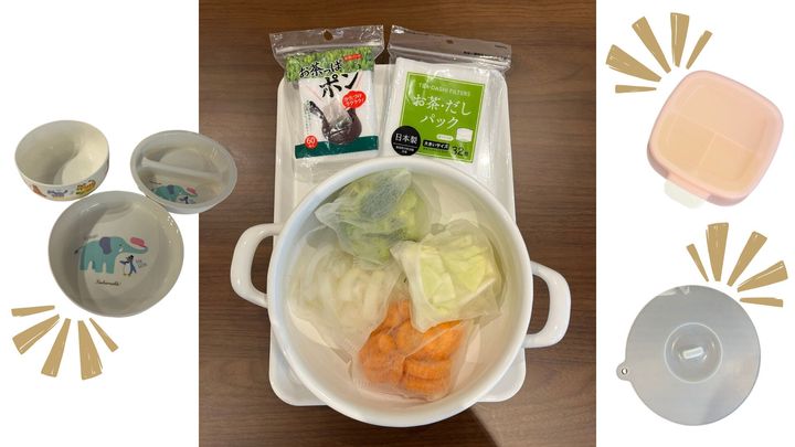 離乳食期のパパ&ママのタスクと言っても過言ではないのが、ゆで野菜のストック。いろいろな種類を用意したいけれどゆで時間が異なる野菜をそれぞれ下処理するのは面倒ですよね。そんなとき、ぐっち夫婦・SHINOさんが活用しているのが「お茶パック」。小さくカットした野菜を種類ごとにお茶パックに入れてひとつのお鍋に入れれば、同時調理でもそれぞれのゆで時間で引き上げられて便利です、とのこと。一度に大量の野菜をゆでられるお茶パック戦法は、目から鱗のライフハック!