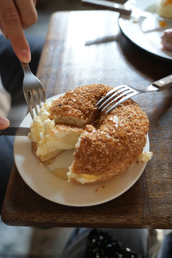 ゴマのかかったベーグルに、クリームチーズをたっぷり入ったイッチベーグル。