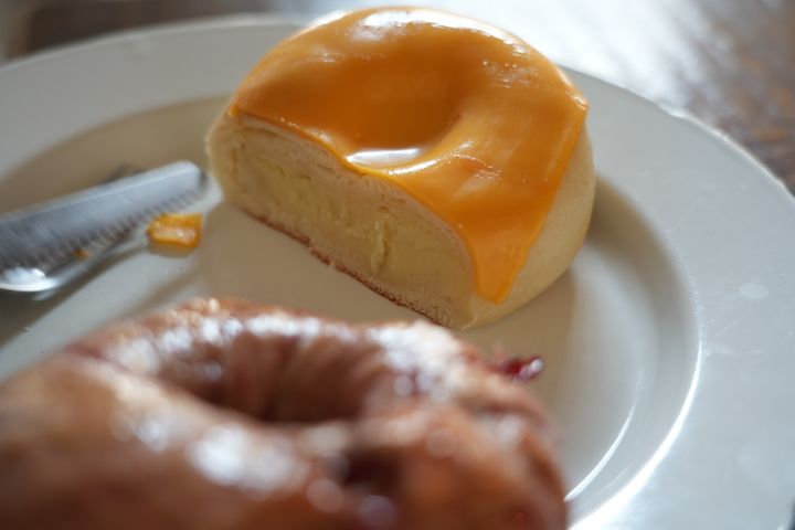 ずっしりとしたベーグルの上には、チェダーチーズがトッピングされたベーグル。