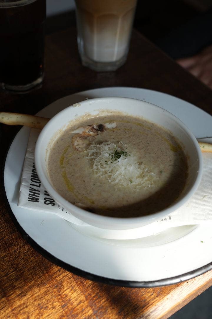 一口食べると、スープの滑らかなクリーミーさが心地よく、マッシュルームの細かい粒感がアクセントに。