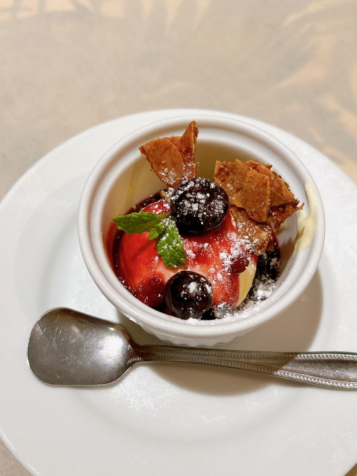 ベリーソースがバニラアイスを飾った、華やかな見た目のデザートです。
