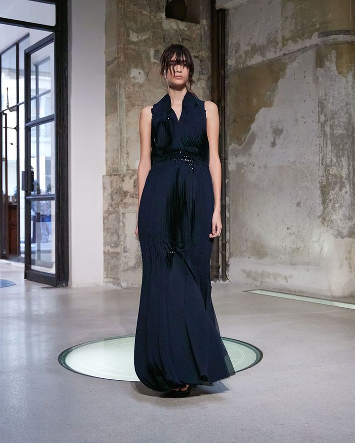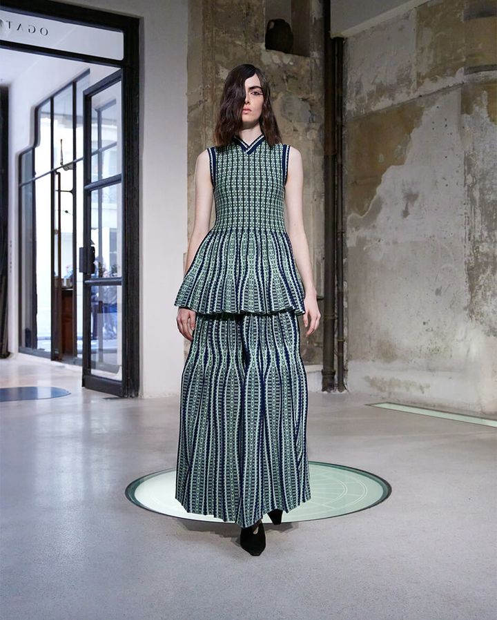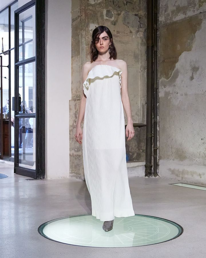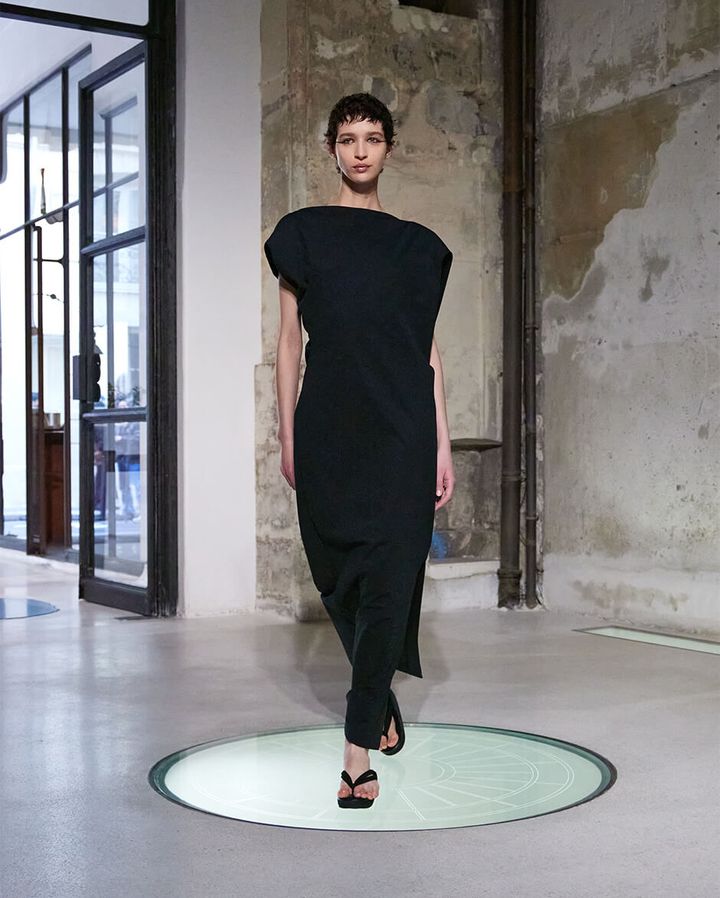 小石や貝、またはそれらを模した芸術品の「かたち」に共通する、形成までの長い道のりと自然界に秘められたプロセス、あるいは偶然性がもたらす造形は、たおやかなカーブを描くドレスやトップスのアシンメトリーなシルエットに。