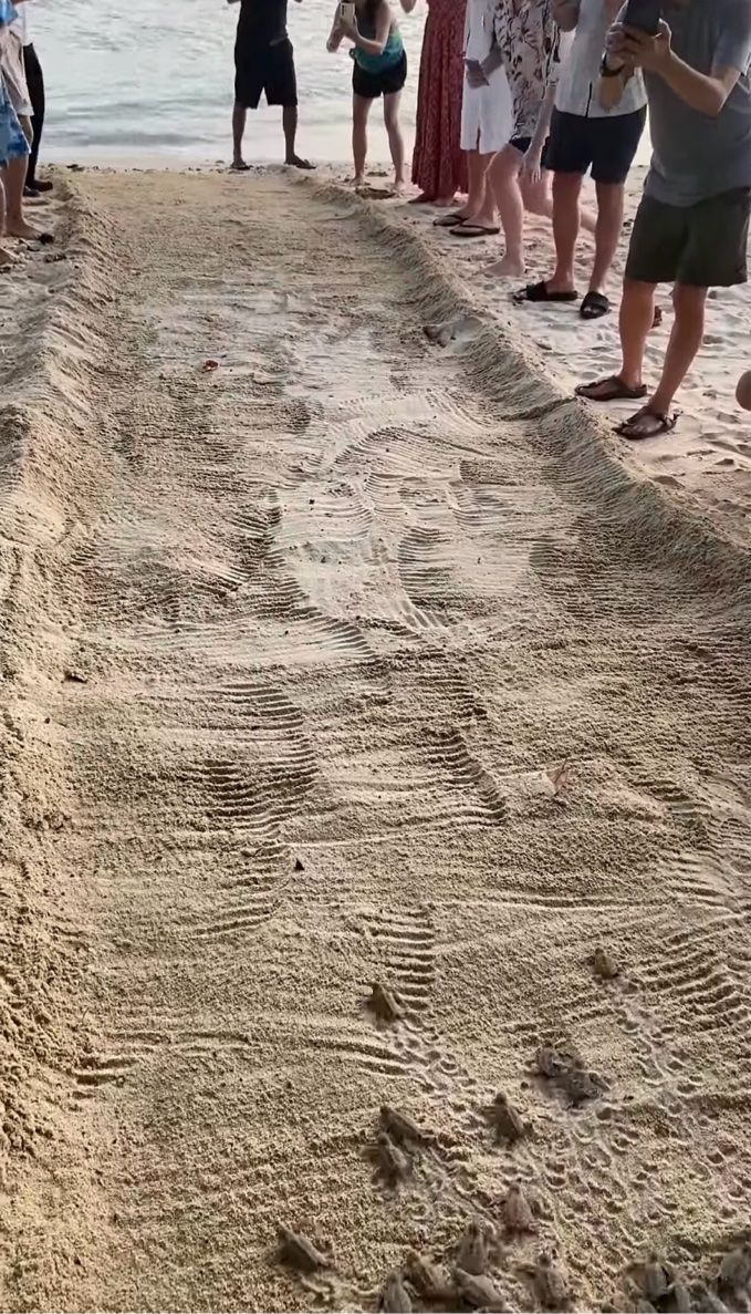 砂浜から海に向かって、なにやら花道ができています。 両脇に集まった人たちがカメラを向ける先には・・・、孵化したばかりのカメの赤ちゃんたちの姿が!