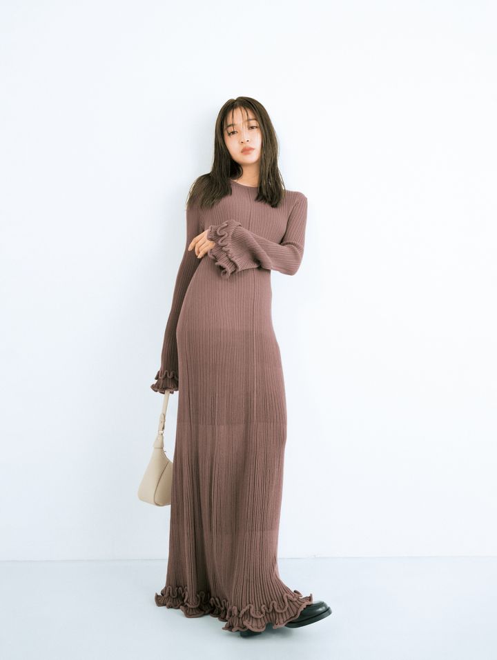 派手さはないけど、ドラマティック。飾らずともマチュアな色気が漂う。そんな"余韻が残る女"が最後の女。一見シンプルなロングワンピながら袖にたっぷり使ったフリルなどのディテールにドラマのあるアイテムを選ぶのと、あえて男受けを狙いすぎない自分が本当に好きな服を好きに着ている素直さ、モテを過剰に意識してない点が逆に粋で、印象に深く残るはず♡ こういう主役級ワンピを着る時の最大の成功ポイントは中間色を選ぶこと(今回はシックなブラウン)、徹底して小物をシンプルに抑えること。