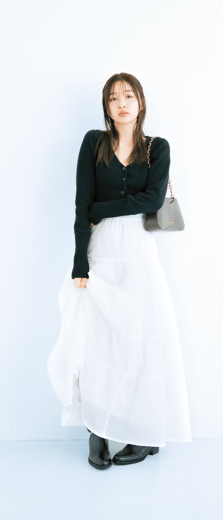 好感度高すぎて人気の白スカート×黒ニットカーデのベーシックな鉄板コーデ。成功の鍵は、丈短のカーデを選んで、胴の長さを短く見せること。さらに足元を重くすると、全身が華奢に見えるという嬉しい効果も。ほわっとした柔らかい白スカートを選んだ分、靴に引き続きバッグも太めのチェーンを選んでピリッと締めると、さらなるスタイルアップをお約束します。