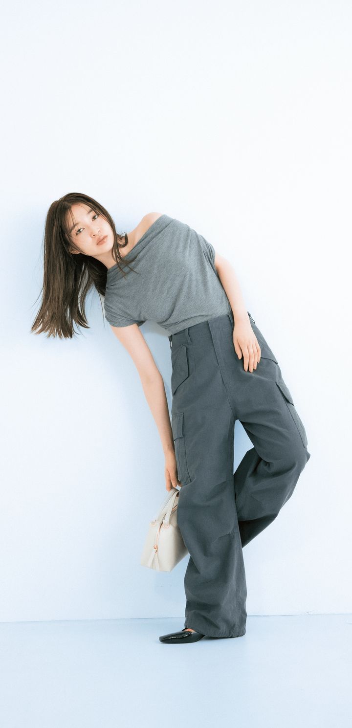 フィット感、肌見せ感、品のいい色、全てがちょうどいい"グレートップス"は、(どのジャンルの男性もオトせる)鉄板の彼女服。胸元の露出はないけど、ボディラインを想像できる点も色っぽい。片方だけの肩の露出が、彼の残像にしっかり焼きつくはず。ここで間違えてはならないのがボトム選び。ボーイッシュなカーゴパンツを選び、ややマニッシュムードに仕上げるのがスマートな選択。