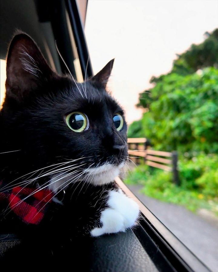 飼い主さんとのお出かけに目を輝かせるネコ。 車内から外を見つめる様子が話題になっています!